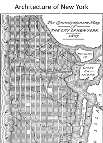 On the other hand, New York's city plan did not have a wall; artillery had made walls unimportant by then. The architecture includes square blocks and long straight streets, which are more convenient for extension, development, and traffic management than for defence.