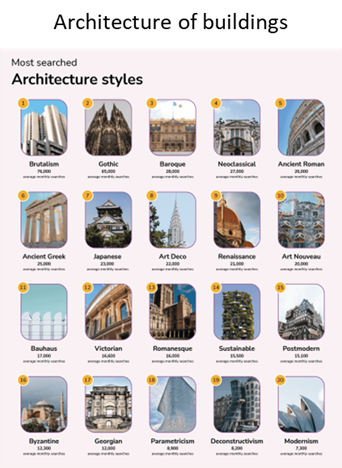 • The most popular is Architecture is the art and technique of designing and building, as distinguished from the skills associated with construction (Britannica)